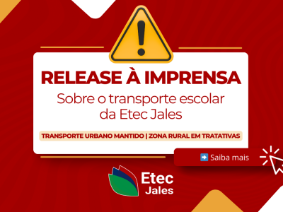 Durante o período de 4 a 12 de novembro, o atendimento presencial da Etec Jales será realizado exclusivamente no Prédio Rural (Escola Agrícola), das 8h às 16h. Pedimos a compreensão de todos e reforçamos que […]