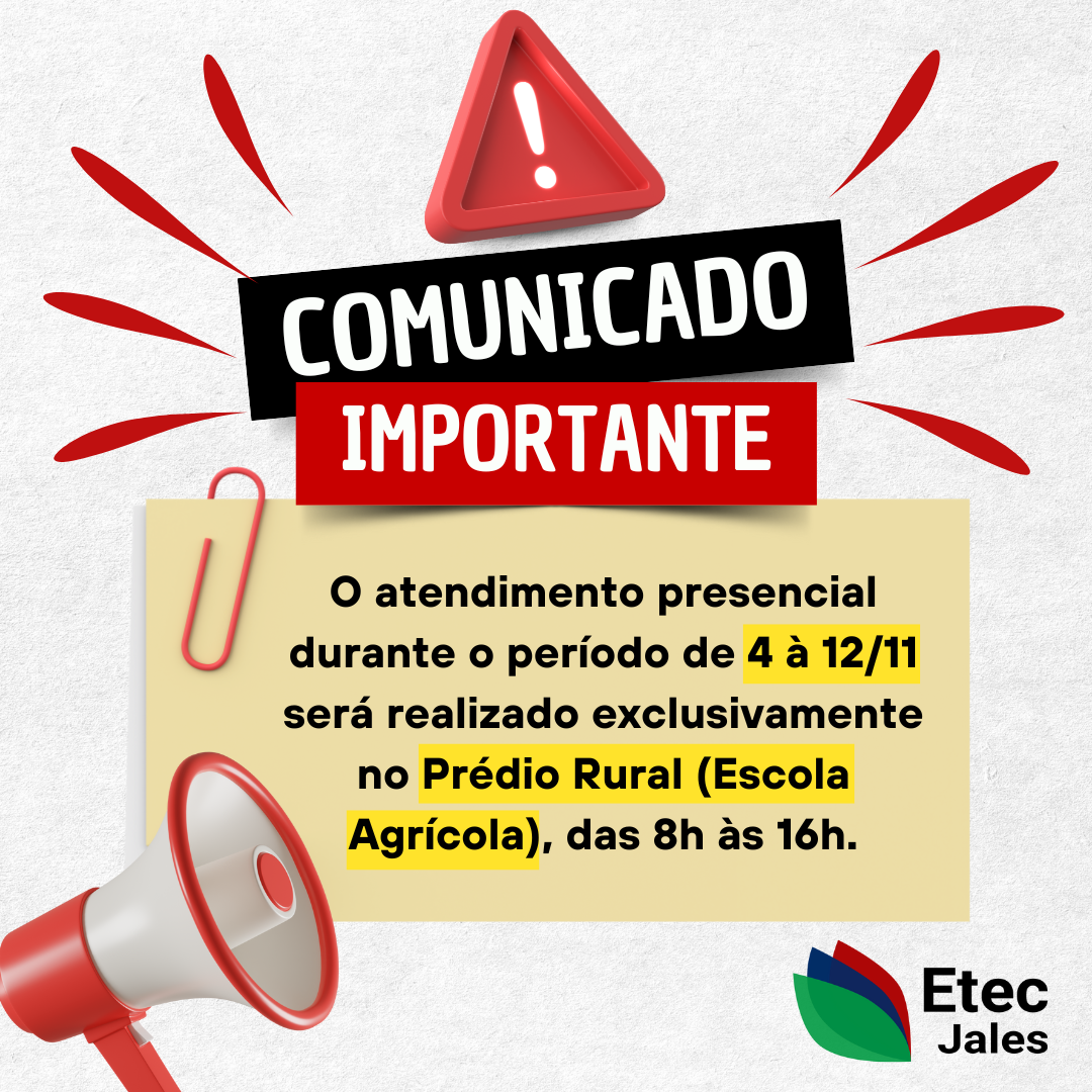 Durante o período de 4 a 12 de novembro, o atendimento presencial da Etec Jales será realizado exclusivamente no Prédio Rural (Escola Agrícola), das 8h às 16h.