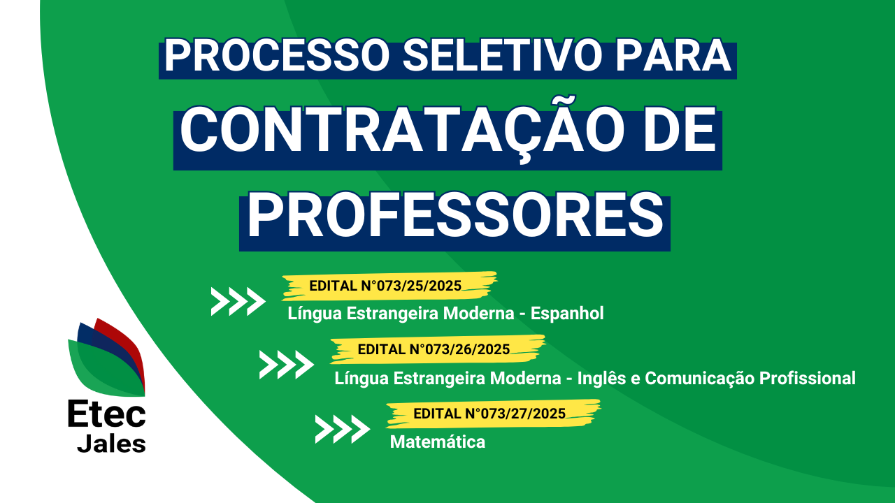 A Escola Técnica Estadual de Jales está com inscrições abertas para processos seletivos simplificados visando a contratação de professores. Confira algumas das disciplinas disponíveis: